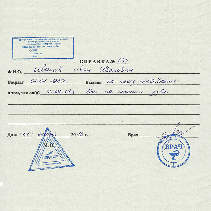 Получить данный документ можно как в государственной, так и в любой частной поликлинике. Цель визита может быть совершенно разной: проверка зрения, сдача крови или флюорография. Самое главное - обязательно попросить у врача-специалиста документ, подтверждающий посещение медицинского учреждения. На справке в обязательном порядке должна быть подпись врача, а также печать специалиста и медицинского учреждения. Только в таком случае документ будет обладать юридической силой и может быть предоставлен руководству организации, где и работает человек.